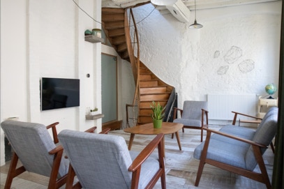 living room with the beautiful spiral stairs. Take in mind these stairs might not be suited for older or less mobile people